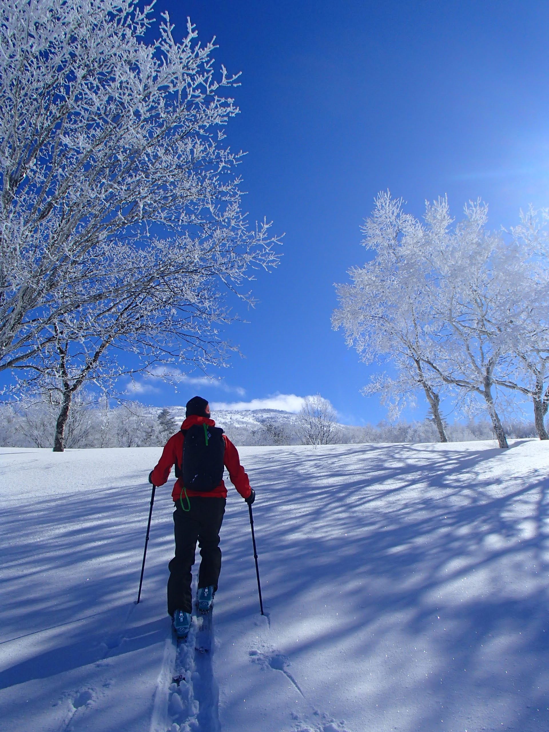 とはいえ、山スキーだと転ばないし、急斜面も怖くないし、細かいターンができるのよねぇ。