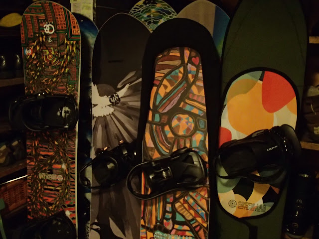 うちの玄関に、ズラリ高価なスノーボードが並びました。