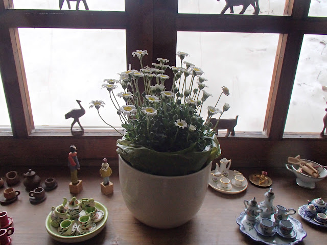 出窓の鉢植えに水をやり「元気でいてね」と声をかける。